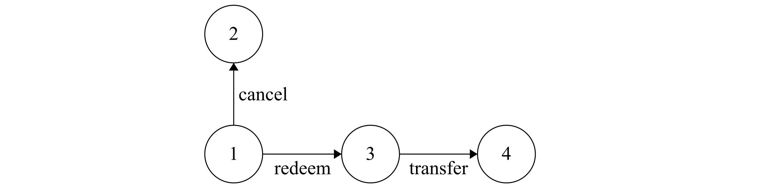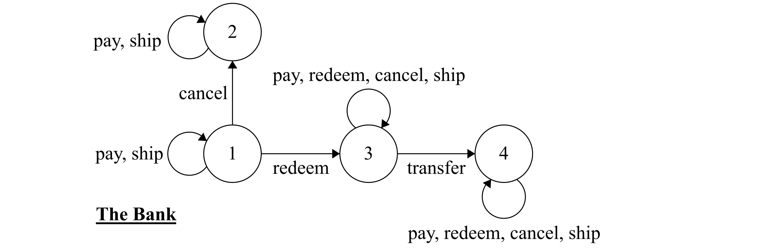 The initial state 1 represents the situation when the bank has issued the money but has not been requested to either redeem it (by the store) or cancel it (by the customer). Once the store redeems the money, the bank enters state 3 and thus can to transfer it to the store’s account. When it’s in state 2, it restores the money to the customer’s account. The fact that we don’t allow the bank to leave state 2 prevents restoring the customer’s money multiple times.