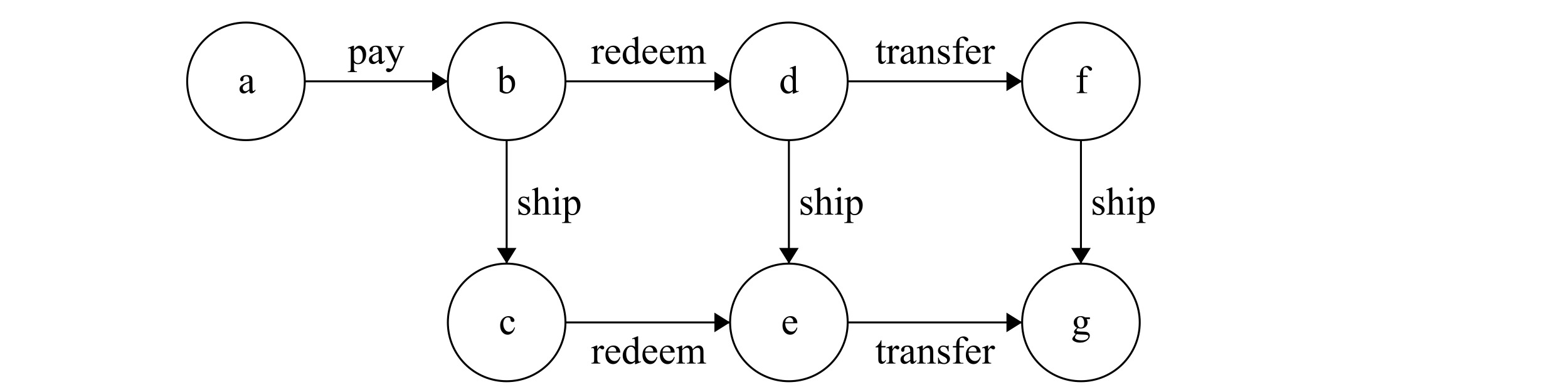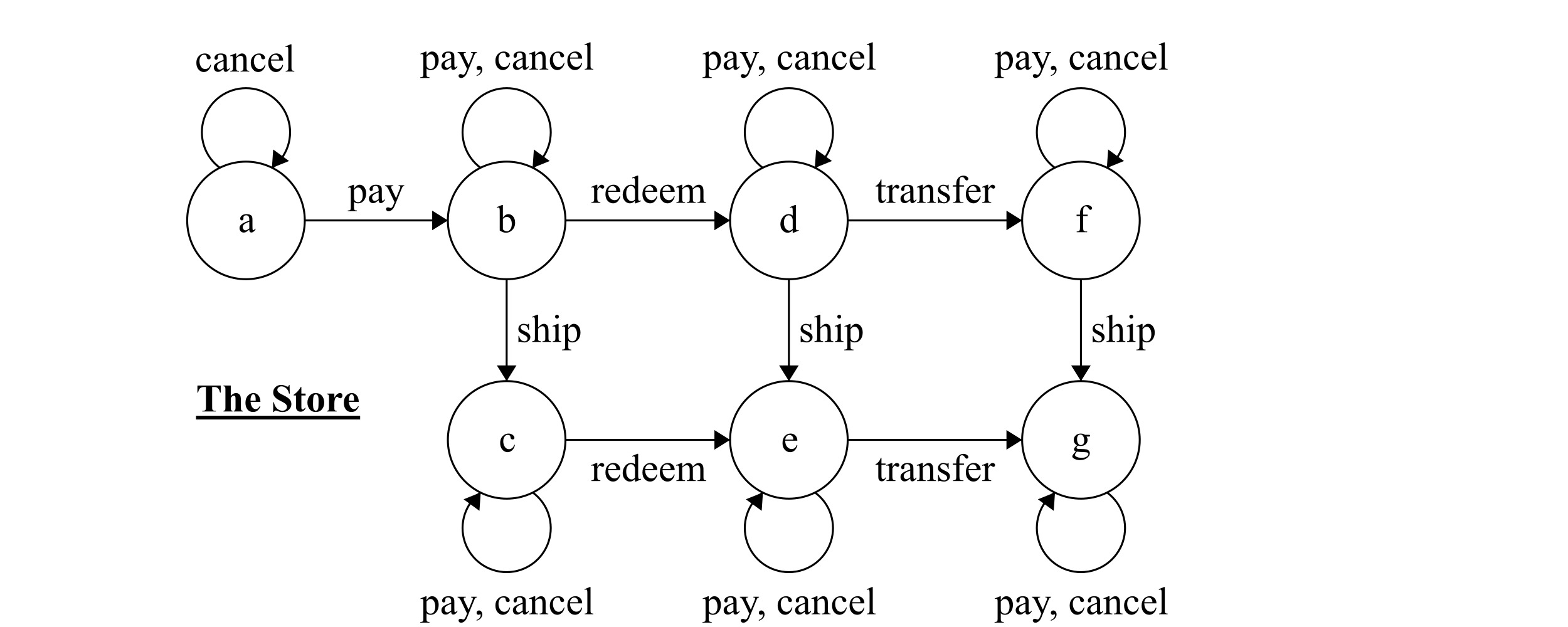 When the pay action is performed (by the customer), the store enters state b. It can then either ship the items or redeem the money from the bank. It can also ship when it has made a redeem request and before the money is transferred, or at the end when the money is transferred by the bank.