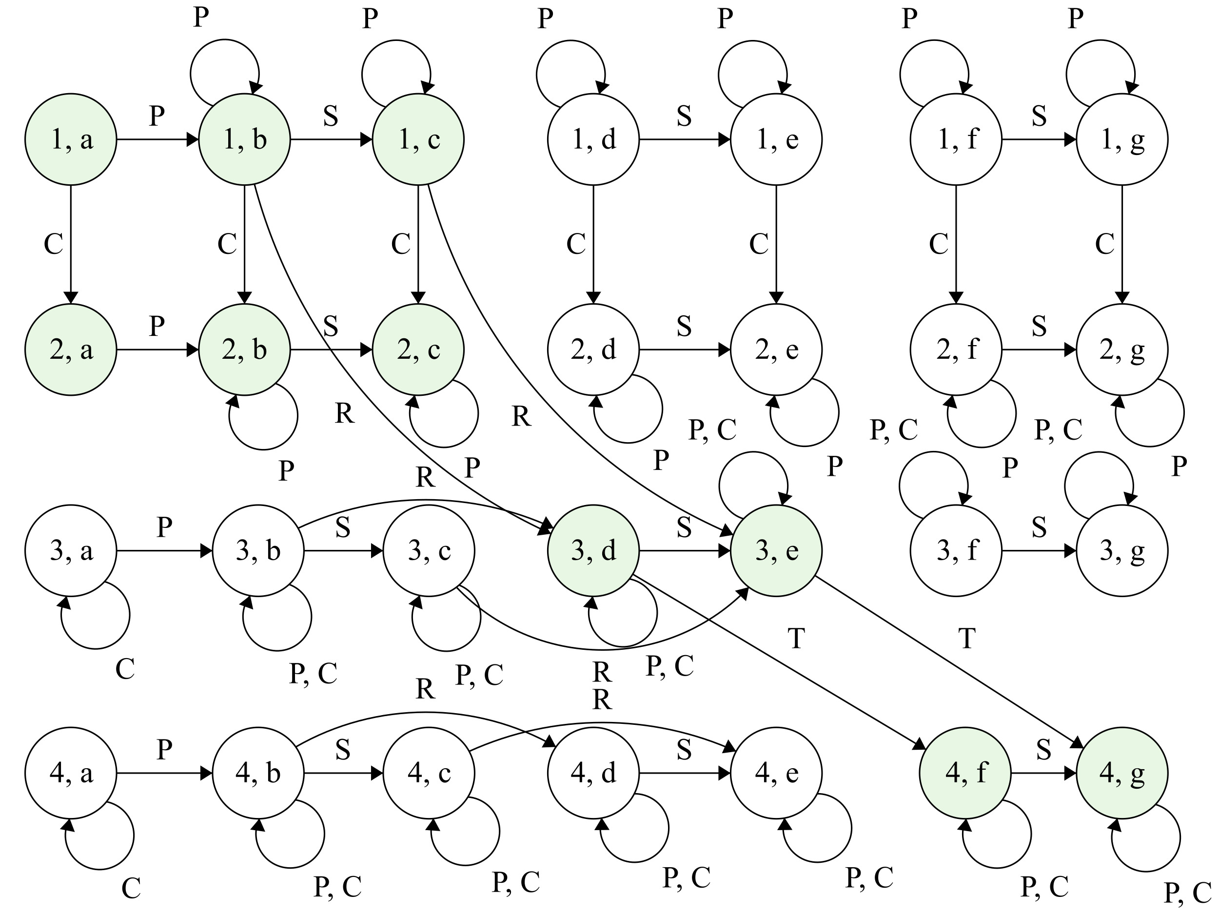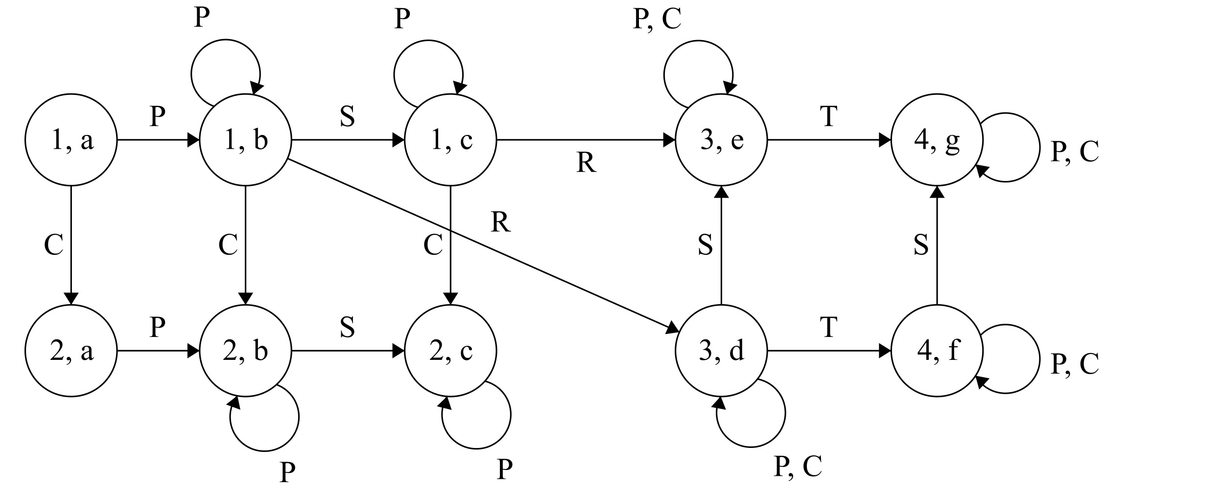 For example, the state (3,d) represents the situation where the bank is in state 3 and the store is in state d. The total amount of states is 4x7=28. We group them in a table where the row corresponds to the state of the bank and the column to the state of the store. The initial state is the pair, both items of which are initial states of their respective machines - in our case (1,a).